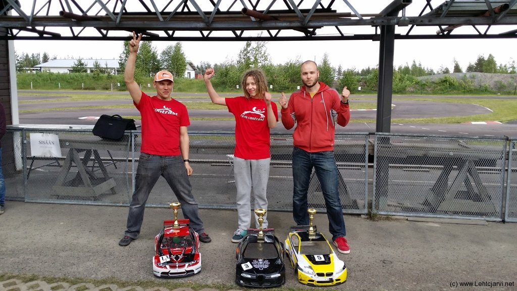 Finaalin alkulämmittelyissä rengas tuntui hyvältä ja nopealta, sitähän se myös oli finaalin ensimmäisen 10 minuutin aikana. Vesa Rousku lähti paalulta ja joutui luovuttamaan johtopaikkansa pari kolmen kierroksen jälkeen, Veskulla lähti auton perä hieman kirjoittamaan etusuoran alussa ja itse saan paremman lähtökiihtyvyyden, suoran toisessa päässä olin tätä myöden edellä. Siitä eteenpäin pidinkin kärkipaikkaa hallussani ja olin noin 15 minuutin kohdalla kerännyt yli 10 sekunnin kaulan toiseksi nouseeseen Tuomo Otsavaaraan. Tästä eteenpäin alkoikin sitten vaikeudet. H05v2 renkaat olivat lämmenneet liikaa ja autosta tuli hitaampi Tuomo alkoi lähestyä, Tuomo oli valinnut alleen H10/07v2 renkaat. Etumatkaani supisti vielä pääsuoralla seikkaillut kierroksella ohittettava ja jouduin melkein pysähtymään päästäkseni ohi ilman kolarointia. Tuomo pääsi tässä kohdassa ihan puskuriin kiinni, sitten alkoikin valtava puolustustaistelu, Tuomolla riitti pitoa ja minä tuskailin ylikuumilla renkailla. Pidin kuitenkin erittäin tiukkaa linjaa joten Tuomolle ei jäänyt tilaa ohituksille, mieletöntä vääntöä 25 minuutin kohdalle asti, jolloin hyvin epämääräisesti toimineet jarrut lukittuivat erittäin voimakkaasti. Kurvi menee pitkäksi ja Tuomo kurvaa sisäkautta reilusti ohi. Matkani jatkuu vielä reilu 3 minuutin verran ja päättyy sitten radan varteen. Toisen etupyörän ripustus petää ja ajoa ei voinut enään jatkaa. Jarrut olivat lämmittäneet pyörän navat niin kuumiksi, että ruuvilukite oli pehmennyt, loppu onkin sitten helppo arvata. Täytyy miettiä ko. ruuvien kiinnitys uudelleen, pelkkä lukite ei toimi. Hyvinkää ei petä, kauden ’14 Hyvinkää viikonloppu oli myös surullinen, ei se Hyvinkään vika tietenkään ole, mutta mieleen painuva sattuma. Hienoa oli että Antti Laurinkoski ylsi vihdon podiumille asti, Antillakin on tämän sorttiset tulokset odottaneet pitkään teknisistä murheista johtuen. Nyt koko 30 minuuttia meni ilman ongelmia ja se näkyy tuloksessa.