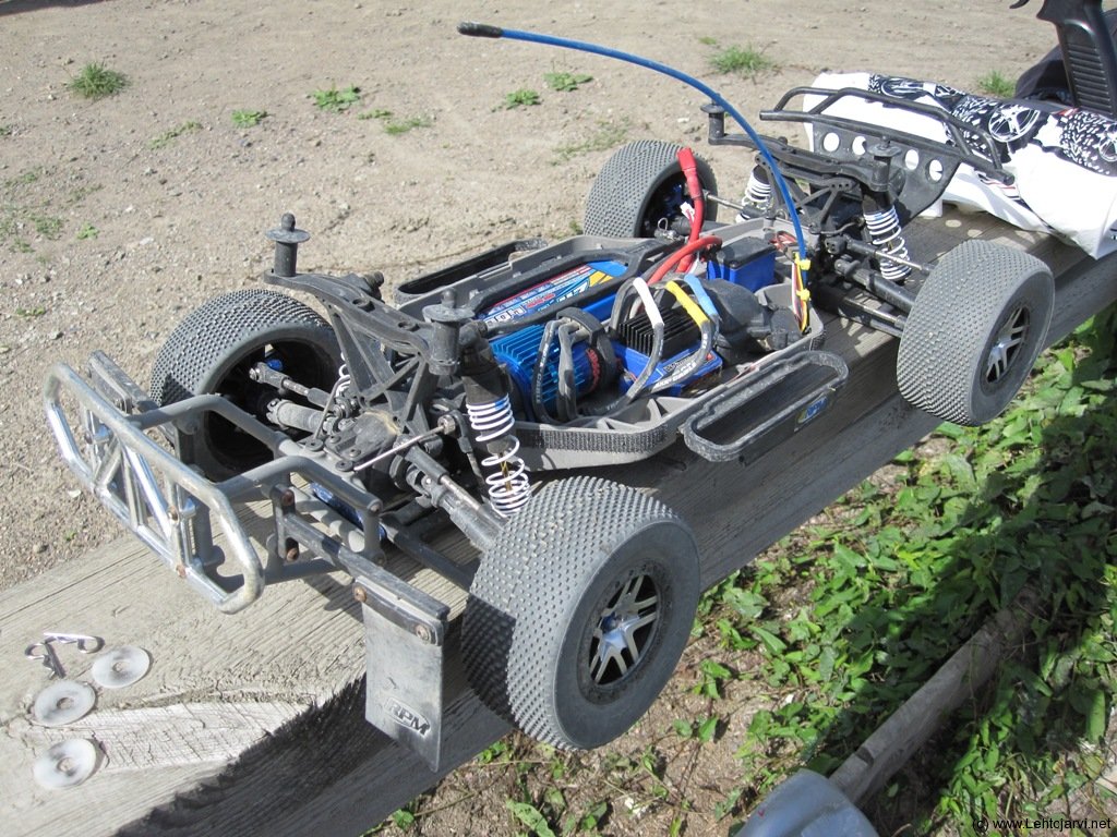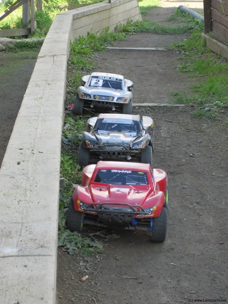 Lähtö on vaikea, pölyinen rata tekee kiihdyttämisen vaikeaksi. Ensimmäinen finaali on muutenkin hankala, kun auto ei oikein käänny vedolla ja kun alkaa kääntyä tahtoo mennä pyörimiseksi. Mokailen sen verran, että putoan kakkoseksi ja saan tämän hädin tuskin pidettyä. Olin ensimmäisen finaalin toinen. Vaihdoin käytössä oleet takarenkaat eteen ja uudet taakse. Olin tähän asti ajanut rengastuksella HB:n Megagrid renkaat takana ja edessä Blitz:n vakiot Maxxis Trepador renkaat. Kahteen jälkimmäiseen finaaliin siis täysi kierros Megagrid renkaita alle. Vaihdoin takarenkaat eteen vaikkakin olivat kuin uudet.