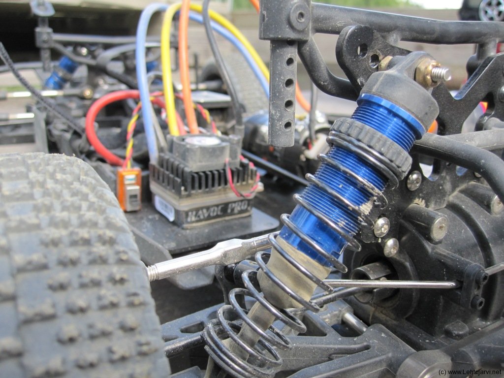 Tähän mennessä en ollut auton setuppia vielä muuttanut. Rata oli kuitenkin sen verran kuivunut ja muuttunut pölyiseksi, että jotain pitää tehdä. Päätin aluksi kuitenkin vain huoltaa auton iskarit ja tarkastella muutenkin liikkuvia osia finaaleja varten. Vaimetimet olivatkin hieman ”hikoilleet” alapäästä joten huolto oli paikallaan. Ensimmäisen finaalin jälkeen muutin takalinkin sisäpäästä pidemmäksi (sisempi reikä) ja siirsin takavaimentimien yläkiinnityksen sisimpään reikään iskarituessa.